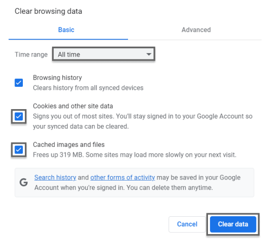 - Selecione Intervalo de Tempo > Todo o período e marque as caixas ao lado de Cookies e Cache.
